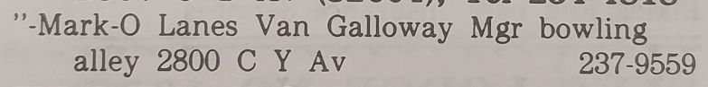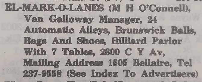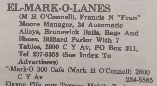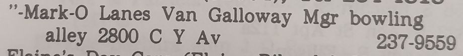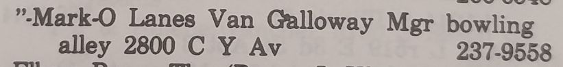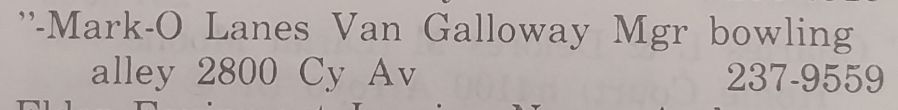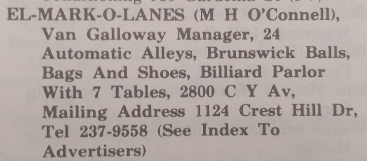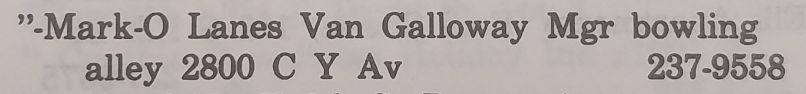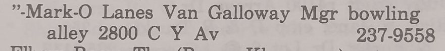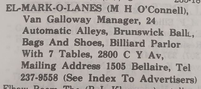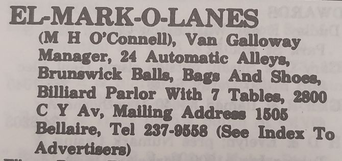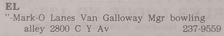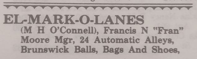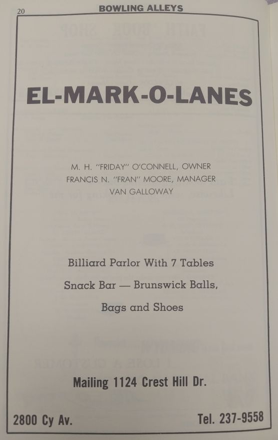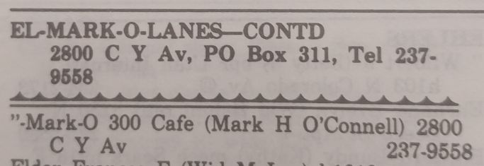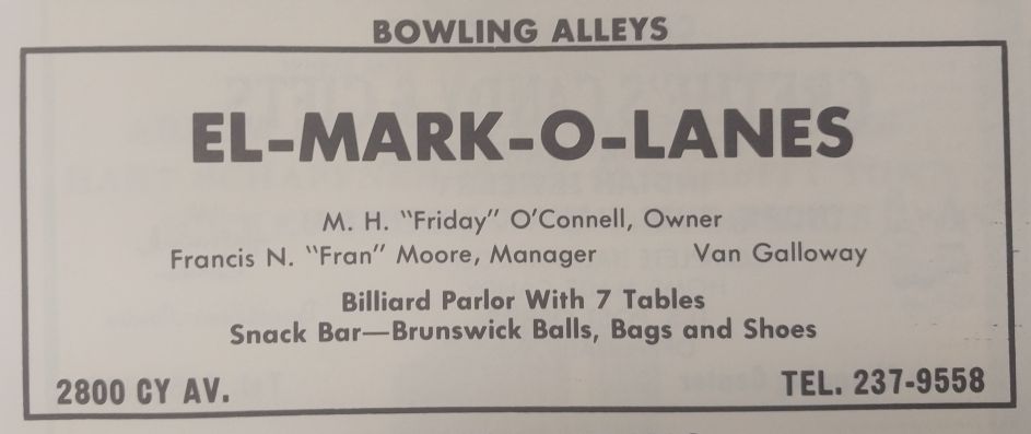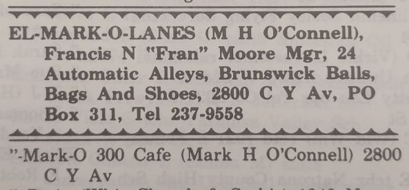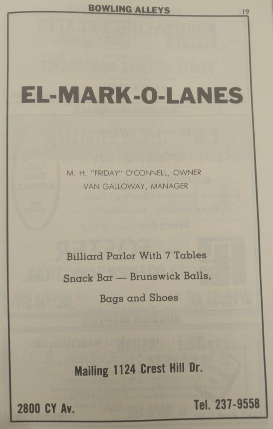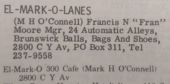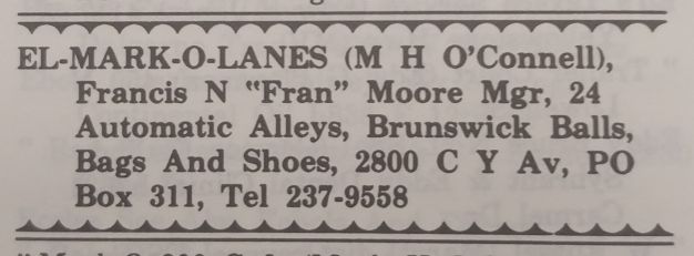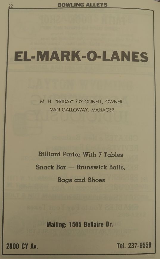 In 1969, the 24th Annual Wyoming Women's State Bowling Tournament held the Team Event here in conjunction with the Doubles & Singles Event at Hilltop Bowl. In 1986, the 38th Annual Wyoming Men's State Bowling Tournament held the Doubles & Singles Event here in conjunction with the Team Event at Sunrise Lanes. In June 1992, the Women's High Five Tournament winners were the team from El Marko Lanes, consisting of Sherie Eklund, Nancy Barclay, Jan Cowell, Lori Monroe and Theola Tomlin. In 1993, Van Galloway was the proprietor per the 45th Wyoming Men's State Bowling Tournament booklet. In 1997, the 52nd Annual Wyoming Women's State Bowling Tournament was held here. In 1998, the 50th Annual Wyoming Men's State Bowling Tournament was held here. In 2003, the 55th Annual Wyoming Men's State Bowling Tournament was held here in conjunction with Eagle Bowl. |