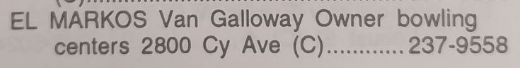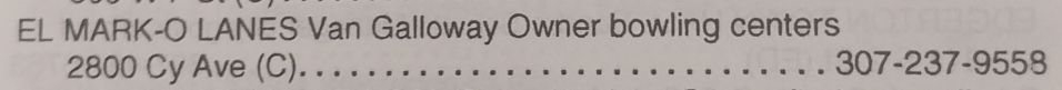 M H O'Connell was the owner and Francis N Moore was the manager per the 1962 through 1976 Casper Polk Directories. In 1969, the 24th Annual Wyoming Women's State Bowling Tournament held the Team Event here in conjunction with the Doubles & Singles Event at Hilltop Bowl. M H O'Connell was the owner and Van Galloway was the manager per the 1977 through 1980 Casper Polk Directories. Van Galloway was the owner/manager per the 1981 through 2009 Casper Polk Directories. In 1986, the 38th Annual Wyoming Men's State Bowling Tournament held the Doubles & Singles Event here in conjunction with the Team Event at Sunrise Lanes. In June 1992, the Women's High Five Tournament winners were the team from El Marko Lanes, consisting of Sherie Eklund, Nancy Barclay, Jan Cowell, Lori Monroe and Theola Tomlin. In 1993, Van Galloway was the proprietor per the 45th Wyoming Men's State Bowling Tournament booklet. In 1997, the 52nd Annual Wyoming Women's State Bowling Tournament was held here. In 1998, the 50th Annual Wyoming Men's State Bowling Tournament was held here. In 2003, the 55th Annual Wyoming Men's State Bowling Tournament was held here in conjunction with Eagle Bowl. |