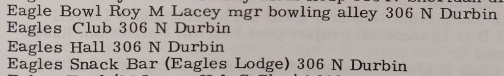 The alleys were a part of the Fraternal Order of Eagles (FOE) lodge #306 but plans are to convert to a dance hall and banquet room. Roy M. Lacey was the manager per the 1960, 1961 & 1962 Casper Polk Business Directory. James B. Buslett was the manager per the 1970, 1971 & 1972 Casper Polk Directory. Bill H. Cummings was the manager per the 1973 Casper Polk Directory. Larry J. Lyewski was the manager per the 1974 Casper Polk Directory. Robert Counts was the manager per the 1975 & 1976 Casper Polk Directory. In 1977, the 29th Annual Wyoming Men's State Bowling Tournament held the Team Event here in conjunction with the Doubles & Singles Event at Hilltop Bowl. Ed Cardinal and Gene Coble were the managers per the 1977, 1978 & 1979 Casper Polk Directory. Ed Cardinal was the manager per the 1981 through 1992 Casper Polk Directories. In 1993, Edd Cardinal was the manager per the 45th Wyoming Men's State Bowling Tournament booklet. Randy Carlen was the owner per the 2002 through 2009 Casper Polk Directories. In 2003, the 55th Annual Wyoming Men's State Bowling Tournament was held here in conjunction with El Mark-O Lanes. |