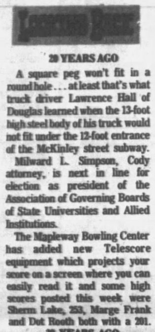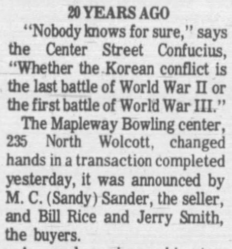 Sandy Sanders was the owner and manager of the alleys per several 1950 Tribune-Herald articles. Bill Rice and Jerry Smith buy the bowling center from M. C. (Sandy) Sanders on Sept 1, 1950. In 1950, the 6th Annual Wyoming Women's State Bowling Tournament was held here. In 2023, this address was a fitness training facility. |